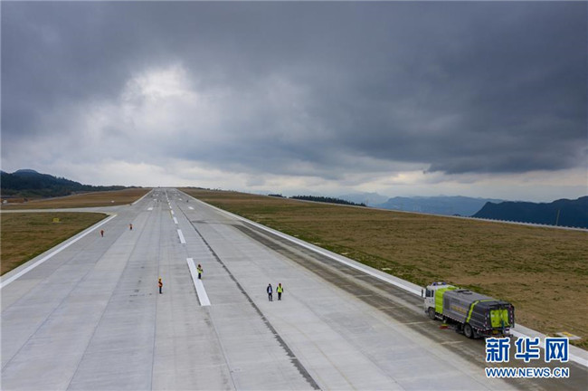 8月12日,校飛正式開始前一天,工作人員對(duì)仙女山機(jī)場跑道路面進(jìn)行清潔(無人機(jī)照片)。新華社記者 劉潺 攝