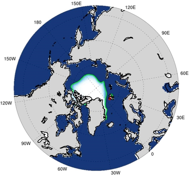 ▲中科院大氣物理研究所ANSO IAP-LASG北極海冰動力集合預(yù)測系統(tǒng)6月份發(fā)布的9月份北極海冰范圍預(yù)測,綠色實線為預(yù)測的北極海冰范圍,白色區(qū)域為海冰區(qū)域。圖片來源:中國科學(xué)報