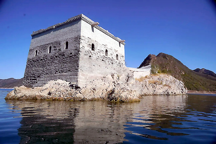 1975年至1981年,為了給天津供水,利用這里的山形地勢,在灤河上游寬城、遷西、興隆三縣交界處,修建了潘家口水庫。引灤入津工程橫切長城,喜峰口、潘家口兩座雄關(guān)鑲?cè)胍惶侗滩?,從而形成萬里長城一處絕景——“水下長城”。