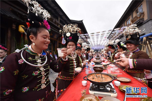 10月18日,苗族群眾在貴州省丹寨縣萬達小鎮(zhèn)吃新節(jié)長桌宴上品嘗佳肴。當日,貴州省黔東南苗族侗族自治州丹寨縣萬達小鎮(zhèn)舉辦苗族吃新節(jié)體驗活動。當?shù)孛缱逋J笙舞、品長桌宴,并邀請游客參與其中,大家在歡聲笑語中樂享金秋。新華社發(fā)(凱尚宇攝)