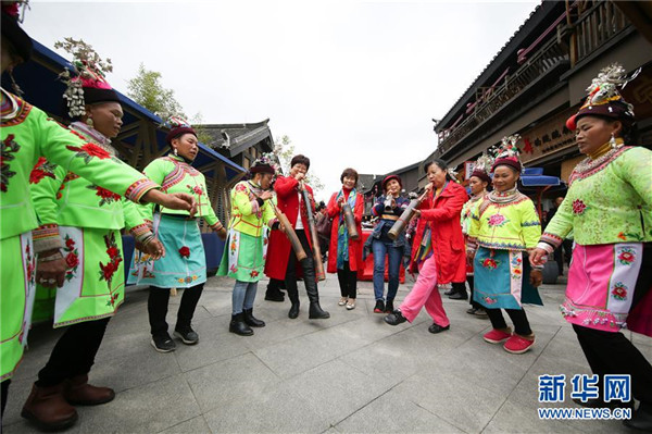 10月18日,游客在貴州省丹寨縣萬達小鎮(zhèn)吃新節(jié)上體驗苗族傳統(tǒng)蘆笙舞。當日,貴州省黔東南苗族侗族自治州丹寨縣萬達小鎮(zhèn)舉辦苗族吃新節(jié)體驗活動。當?shù)孛缱逋J笙舞、品長桌宴,并邀請游客參與其中,大家在歡聲笑語中樂享金秋。新華社發(fā)(黃曉海攝)