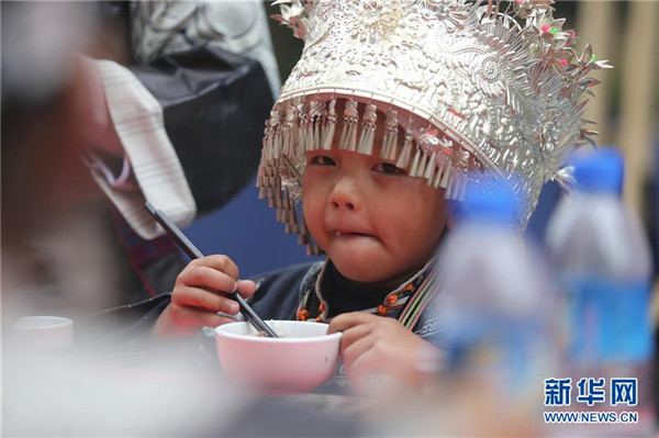 10月18日,一名小朋友在貴州省丹寨縣萬達小鎮(zhèn)吃新節(jié)長桌宴上品嘗佳肴。當日,貴州省黔東南苗族侗族自治州丹寨縣萬達小鎮(zhèn)舉辦苗族吃新節(jié)體驗活動。當?shù)孛缱逋J笙舞、品長桌宴,并邀請游客參與其中,大家在歡聲笑語中樂享金秋。新華社發(fā)(張暉攝)