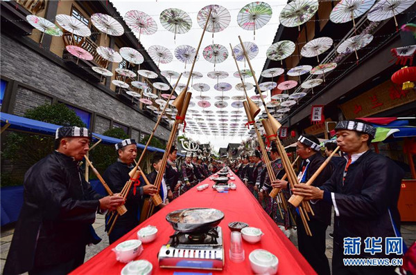 10月18日,苗族群眾在貴州省丹寨縣萬達小鎮(zhèn)吃新節(jié)長桌宴上助興。當日,貴州省黔東南苗族侗族自治州丹寨縣萬達小鎮(zhèn)舉辦苗族吃新節(jié)體驗活動。當?shù)孛缱逋J笙舞、品長桌宴,并邀請游客參與其中,大家在歡聲笑語中樂享金秋。新華社發(fā)(楊武魁攝)