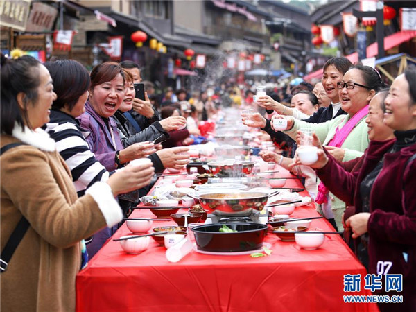 10月18日,游客在貴州省丹寨縣萬達小鎮(zhèn)吃新節(jié)長桌宴上品嘗佳肴。當日,貴州省黔東南苗族侗族自治州丹寨縣萬達小鎮(zhèn)舉辦苗族吃新節(jié)體驗活動。當?shù)孛缱逋J笙舞、品長桌宴,并邀請游客參與其中,大家在歡聲笑語中樂享金秋。新華社發(fā)(陸德華攝)