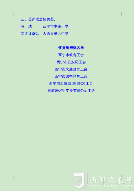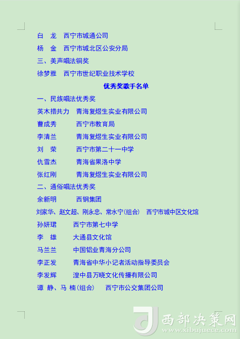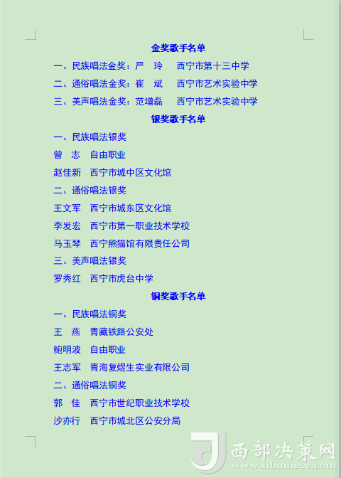本次比賽旨在通過歌手們的激情演繹,增強全市廣大職工群眾的獲得感、幸福感、安全感,展現(xiàn)西寧市職工群眾的時代風貌,進一步營造弘揚勞模精神、勞動精神、工匠精神的濃厚氛圍,為更高水平打造綠色發(fā)展樣板城市建設新時代幸福西寧增強信心、凝聚力量。(后附獲獎名單)。