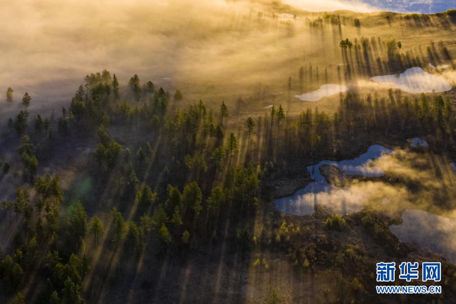 內(nèi)蒙古阿爾山市杜鵑湖畔霧氣繚繞(5月28日攝)?!⌒氯A社發(fā)(畢力格 攝)