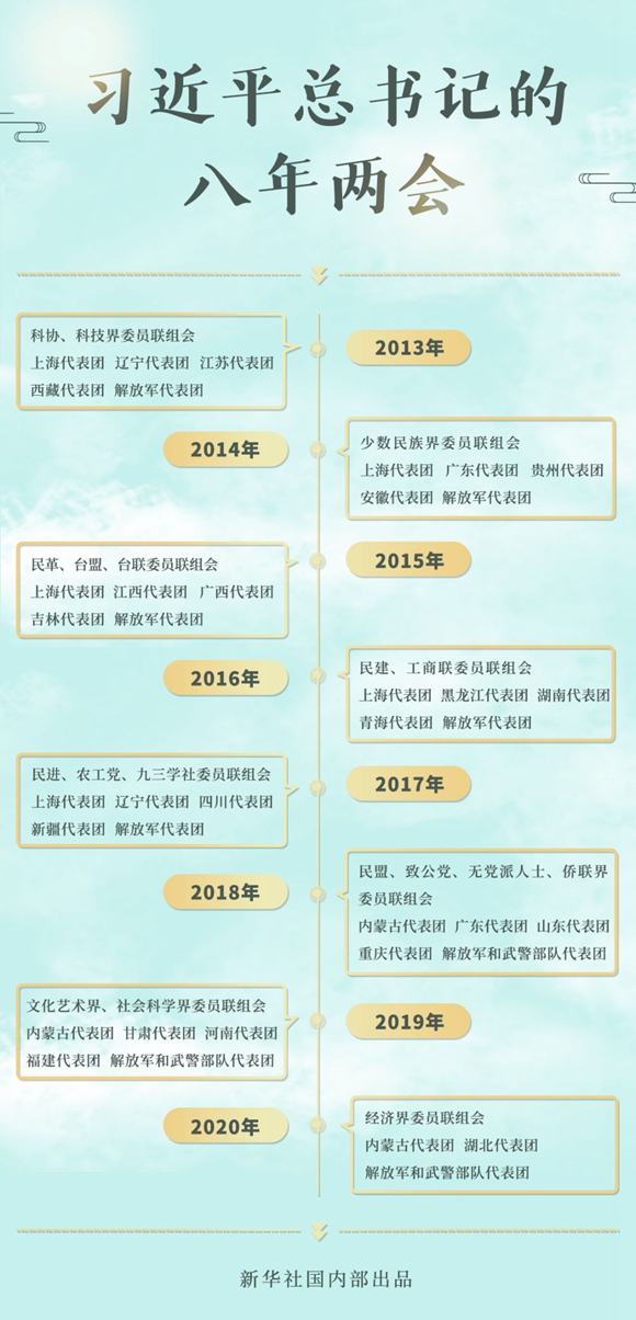 2013-2020,八年的全國兩會上,總書記46次到團組參加審議討論。交流之中,語重心長;言談之間,發(fā)人深思。