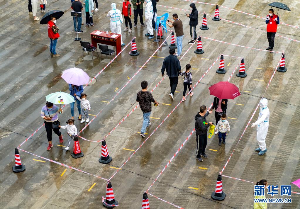 4月6日,在瑞麗市目瑙社區(qū)一核酸檢測點,當地居民通過設置的通道排隊采樣。新華社記者 陳欣波 攝