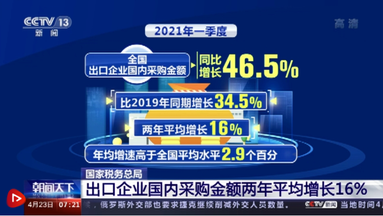 央視網(wǎng)消息:外貿(mào)高質(zhì)量發(fā)展是我國經(jīng)濟增長的重要拉動力。國家稅務總局相關負責人表示,稅務部門積極實施出口退稅便利化措施,一季度全國出口企業(yè)國內(nèi)采購金額兩年平均增長16%。