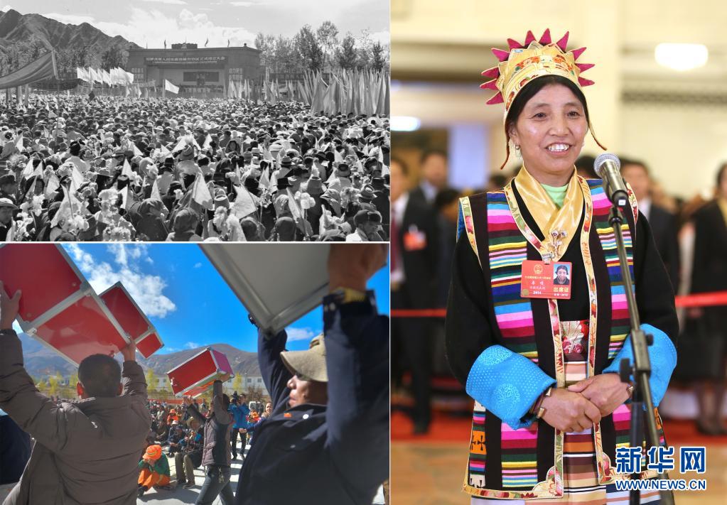 這是一張拼版照片:左上圖為1965年9月9日,拉薩各界各族人民三萬多人舉行集會(huì)游行,熱烈慶祝西藏自治區(qū)正式成立(新華社記者馬競(jìng)秋攝);左下圖為拉薩市柳梧新區(qū)管委會(huì)柳梧鄉(xiāng)柳梧村換屆選舉工作人員展示投票箱(2014年10月29日新華社記者普布扎西攝);右圖為2018年3月11日,十三屆全國人大一次會(huì)議在北京人民大會(huì)堂舉行第三次全體會(huì)議,全國人大代表卓嘎在“代表通道”接受采訪(新華社記者金立旺攝)。新華社發(fā)