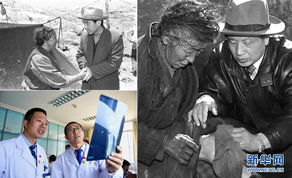 這是一張拼版照片:左上圖為來自陜西的援藏干部阿里日土縣副縣長(zhǎng)賈冗勇深入牧區(qū),幫助藏族牧民解決生產(chǎn)、生活的實(shí)際困難(新華社記者土登攝 1997年11月11日發(fā));左下圖為2017年8月3日,北京積水潭醫(yī)院援藏醫(yī)生龔曉峰(右)和北京天壇醫(yī)院援藏醫(yī)生李家謀在拉薩市人民醫(yī)院骨科病房?jī)?nèi)查看患者的X光片,進(jìn)行工作交接(新華社記者晉美多吉攝);右圖為孔繁森(右)在阿里日土縣過巴鄉(xiāng)為孤寡老人益西卓瑪治病(新華社記者土登攝 1994年12月26日發(fā))。新華社發(fā)
