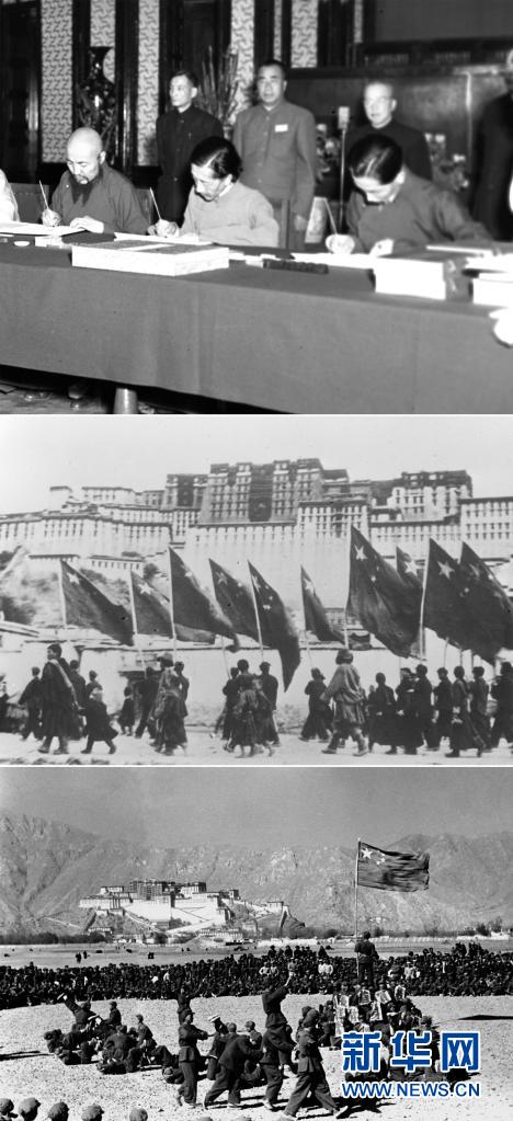 這是一張拼版照片:上圖為1951年5月23日,中央人民政府與西藏地方政府在北京簽訂《關(guān)于和平解放西藏辦法的協(xié)議》(簡(jiǎn)稱“十七條協(xié)議”)。上圖為西藏地方政府代表在協(xié)議上簽字;中圖為1951年10月26日,西藏地方政府為人民解放軍舉行了隆重的入城式,拉薩古城飄揚(yáng)著五星紅旗;下圖為西藏和平解放后,人民解放軍與藏族群眾在布達(dá)拉宮前歡度新年。