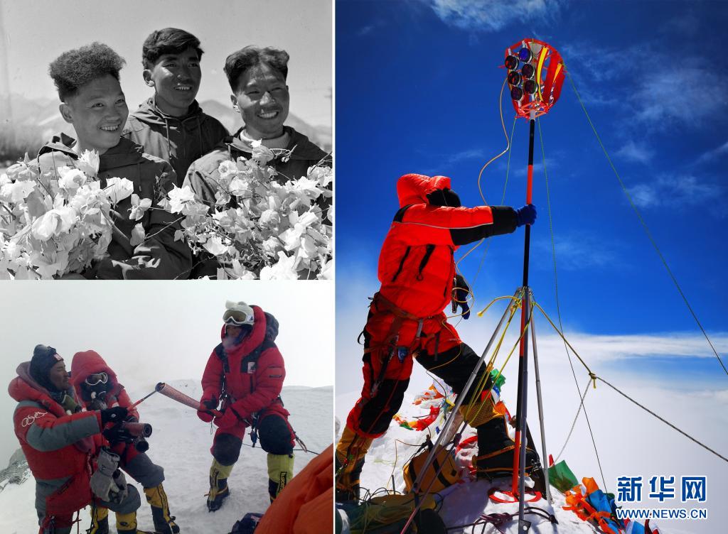 這是一張拼版照片:左上圖為1960年5月登上珠穆朗瑪峰頂?shù)闹袊巧疥?duì)隊(duì)員王富洲(右)、貢布(中)和屈銀華(資料照片 新華社發(fā));左下圖為2008年5月8日,北京奧運(yùn)圣火珠峰傳遞登山隊(duì)隊(duì)員羅布占堆(左)點(diǎn)燃第一棒火炬手吉吉手中的“祥云”火炬(新華社發(fā));右圖為2020珠峰高程測(cè)量登山隊(duì)隊(duì)員在珠穆朗瑪峰峰頂開展測(cè)量工作(2020年5月27日新華社特約記者扎西次仁攝)。新華社發(fā)