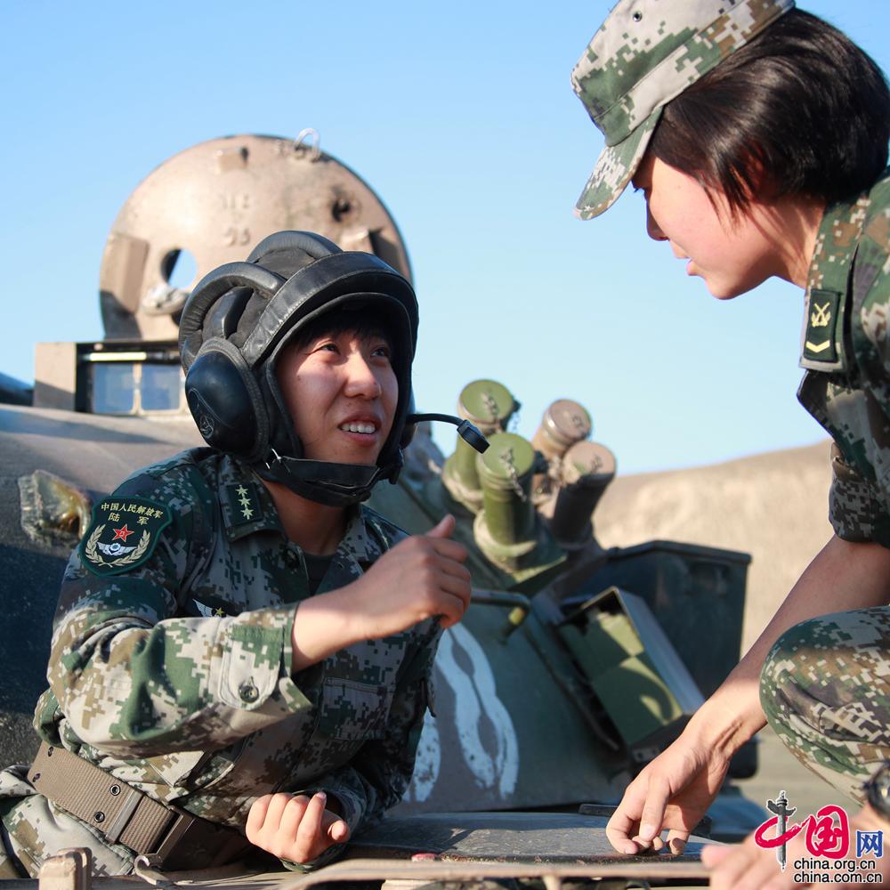 新疆軍區(qū)某合成團(tuán)坦克二連政治指導(dǎo)員馬和帕麗(右一)組織戰(zhàn)術(shù)訓(xùn)練的情景。袁凱 攝