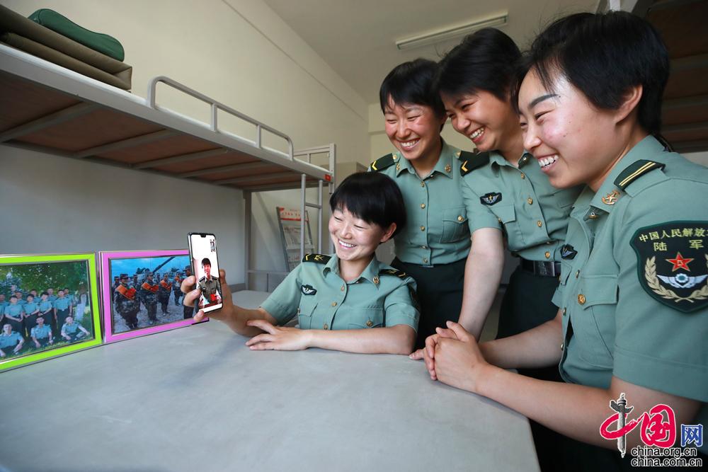全國(guó)“兩會(huì)”期間,全國(guó)人大代表馬和帕麗與女子坦克班視頻連線,介紹參會(huì)情況。袁凱 攝