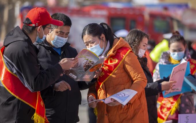 2021年12月4日上午,洛浦縣科技局工作人員在該縣艾德萊斯廣場(chǎng),正在向當(dāng)?shù)鼐用襁M(jìn)行講解“科普知識(shí)”。買買提艾力·艾尼瓦爾攝