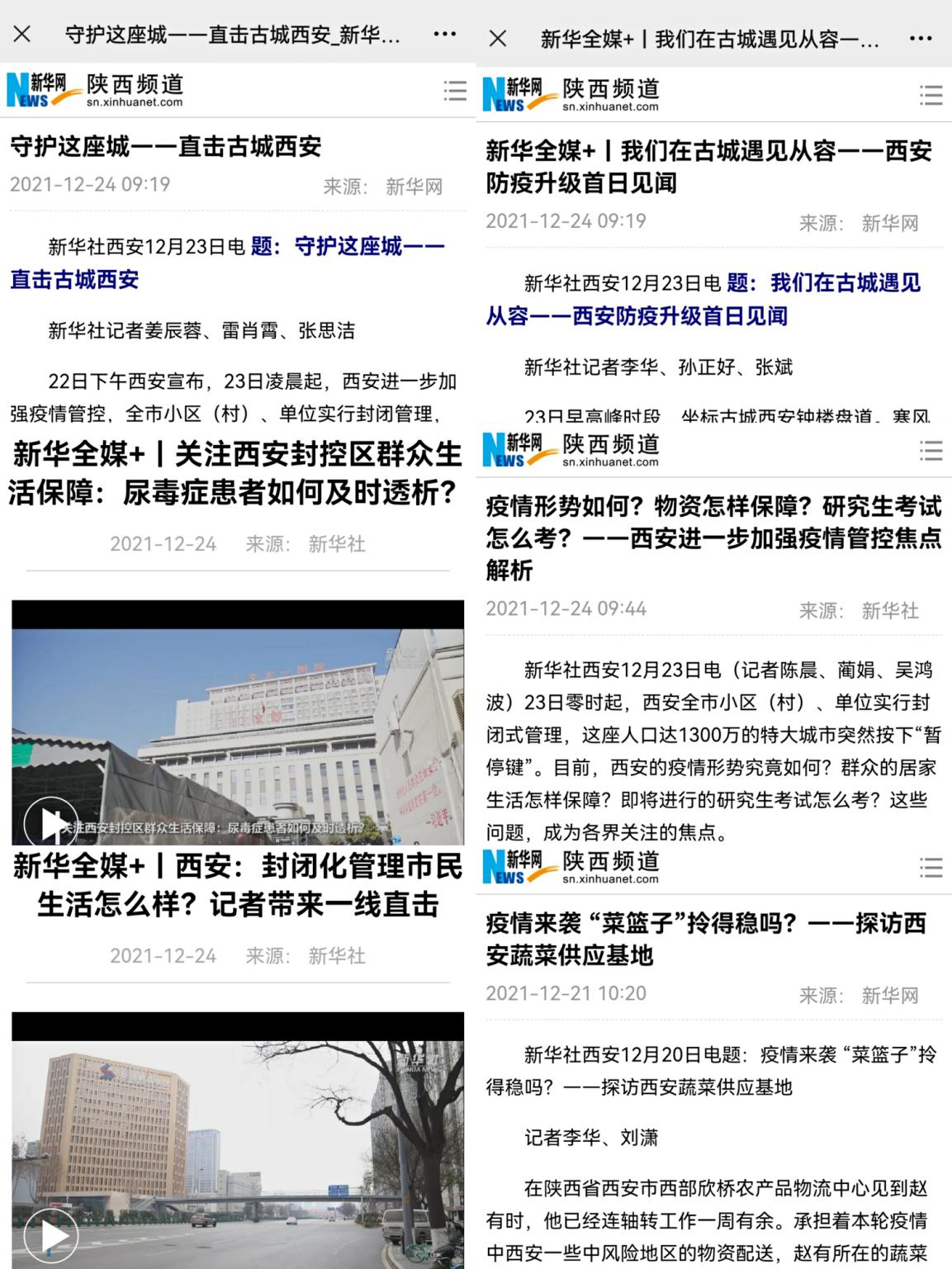 從關(guān)注尿毒癥患者如何及時(shí)透析到封閉化管理市民生活怎樣,從西安防疫升級(jí)首日見聞到記者答疑確診病例為何增長(zhǎng)迅速,從新一輪核酸檢測(cè)現(xiàn)場(chǎng)到蔬菜保供打消市民恐慌……新華社記者每天從城市的各個(gè)角落發(fā)回第一手消息,用他們的筆觸、鏡頭向廣大網(wǎng)民展現(xiàn)西安城的堅(jiān)守和溫暖,最大程度還原這座城市疫情防控過(guò)程中每一個(gè)環(huán)節(jié)的進(jìn)展與成效。