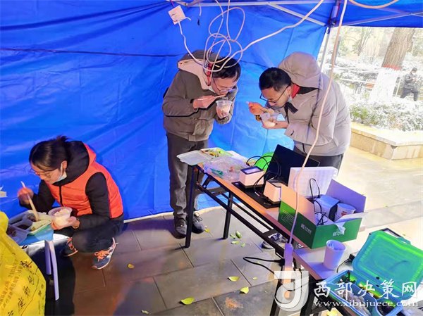 正當(dāng)隊(duì)員們準(zhǔn)備修整一天時(shí),新的命令到了,要求醫(yī)療隊(duì)安排300名隊(duì)員支援雁塔區(qū)核酸采集工作,大家毫無(wú)怨言,坐上了趕赴雁塔區(qū)的大巴。這是最不尋常的一天,醫(yī)療隊(duì)承擔(dān)了雁塔區(qū)近10個(gè)居民區(qū)的核酸采樣任務(wù),且大部分都屬于封控區(qū)。核算采樣需上門(mén)采集,風(fēng)險(xiǎn)大、難度高,因?yàn)樾畔⒉杉O(shè)備無(wú)法上樓,只能依靠人工信息錄入,隊(duì)員們身穿防護(hù)服,在操作極其困難的情況下做到了不漏一戶(hù),不落一人。采集結(jié)束已是25日凌晨1點(diǎn),來(lái)自漢臺(tái)區(qū)的余晗和趙凌最后的采集任務(wù)已是凌晨2點(diǎn),此時(shí)的千年古都正飄落著冬日的雪花。這次入戶(hù)采集共完成49081人次。