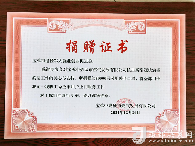 西部決策網(wǎng)訊 (任書彥)12月24日,寶雞市退役軍人就業(yè)創(chuàng)業(yè)促進(jìn)會(huì)向?qū)氹u中燃城市燃?xì)獍l(fā)展有限公司無(wú)償捐贈(zèng)醫(yī)用外科口罩50000只,以全力支持寶雞市抗疫防疫工作。