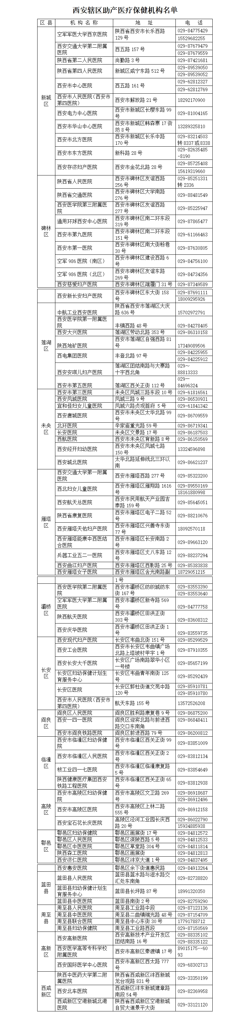 近期陜西省衛(wèi)生健康委整理發(fā)布了西安轄區(qū)助產(chǎn)醫(yī)療保健機構(gòu)名單(見下表),其他地市助產(chǎn)醫(yī)療保健機構(gòu)名單由當?shù)匦l(wèi)生健康部門自行發(fā)布。如有診療需求,請前往各助產(chǎn)醫(yī)療機構(gòu)就診。