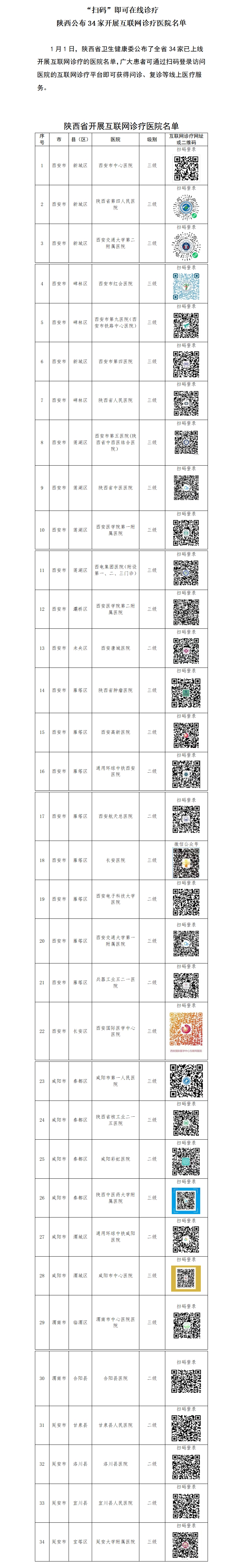 西安、咸陽、渭南、延安34家醫(yī)院已上線互聯(lián)網(wǎng)診療服務(wù),廣大患者可通過掃碼登錄訪問醫(yī)院的互聯(lián)網(wǎng)診療平臺即可獲得問診、復(fù)診等線上醫(yī)療服務(wù)。