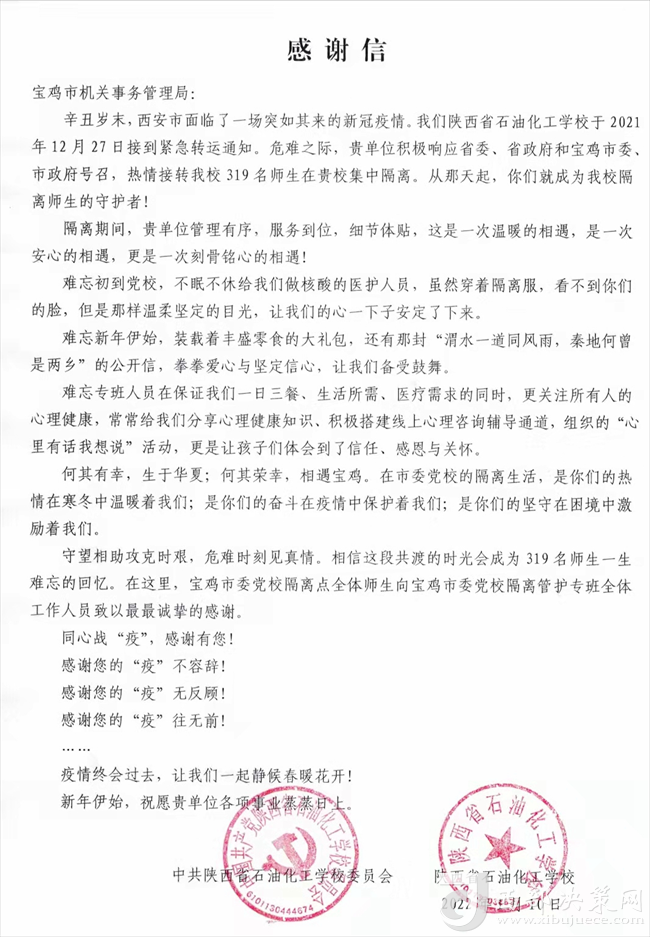 西部決策網(wǎng)訊 (任書彥)12月27日晚9時,寶雞市機關事務管理局接到緊急命令:來自陜西省石油化工學校319名學生將于28日早6時到達寶雞市委黨校開始集中隔離,寶雞市機關事務管理局負責此次隔離學生的后勤保障工作。這是寶雞市機關事務管理局自全國十四運會、第八屆特奧會之后,又迎來的一次“大考”。