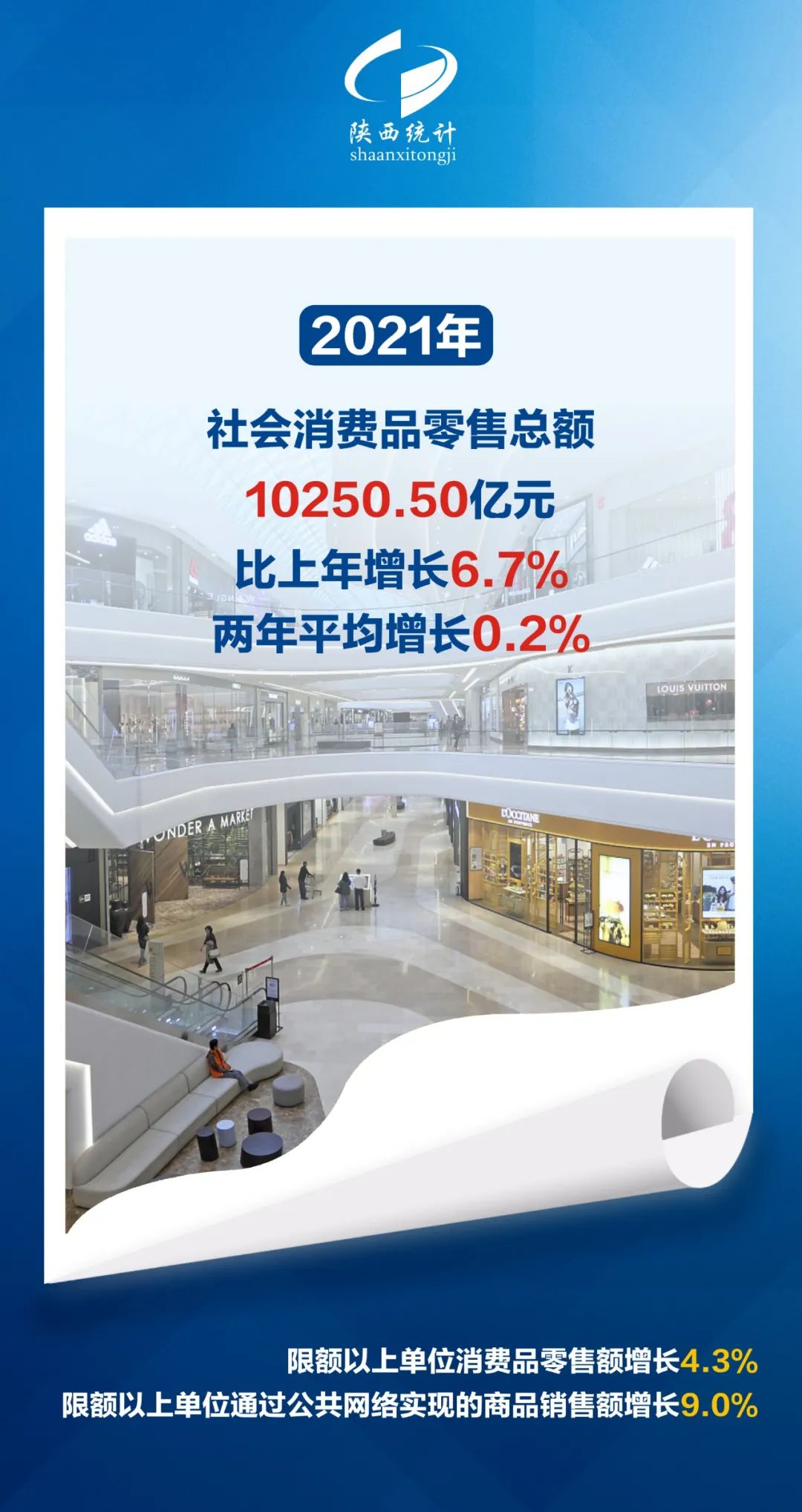 2021年,全省實(shí)現(xiàn)社會(huì)消費(fèi)品零售總額10250.50億元,比上年增長(zhǎng)6.7%,兩年平均增長(zhǎng)0.2%。其中,限額以上單位消費(fèi)品零售額4984.18億元,增長(zhǎng)4.3%,兩年平均下降0.5%。