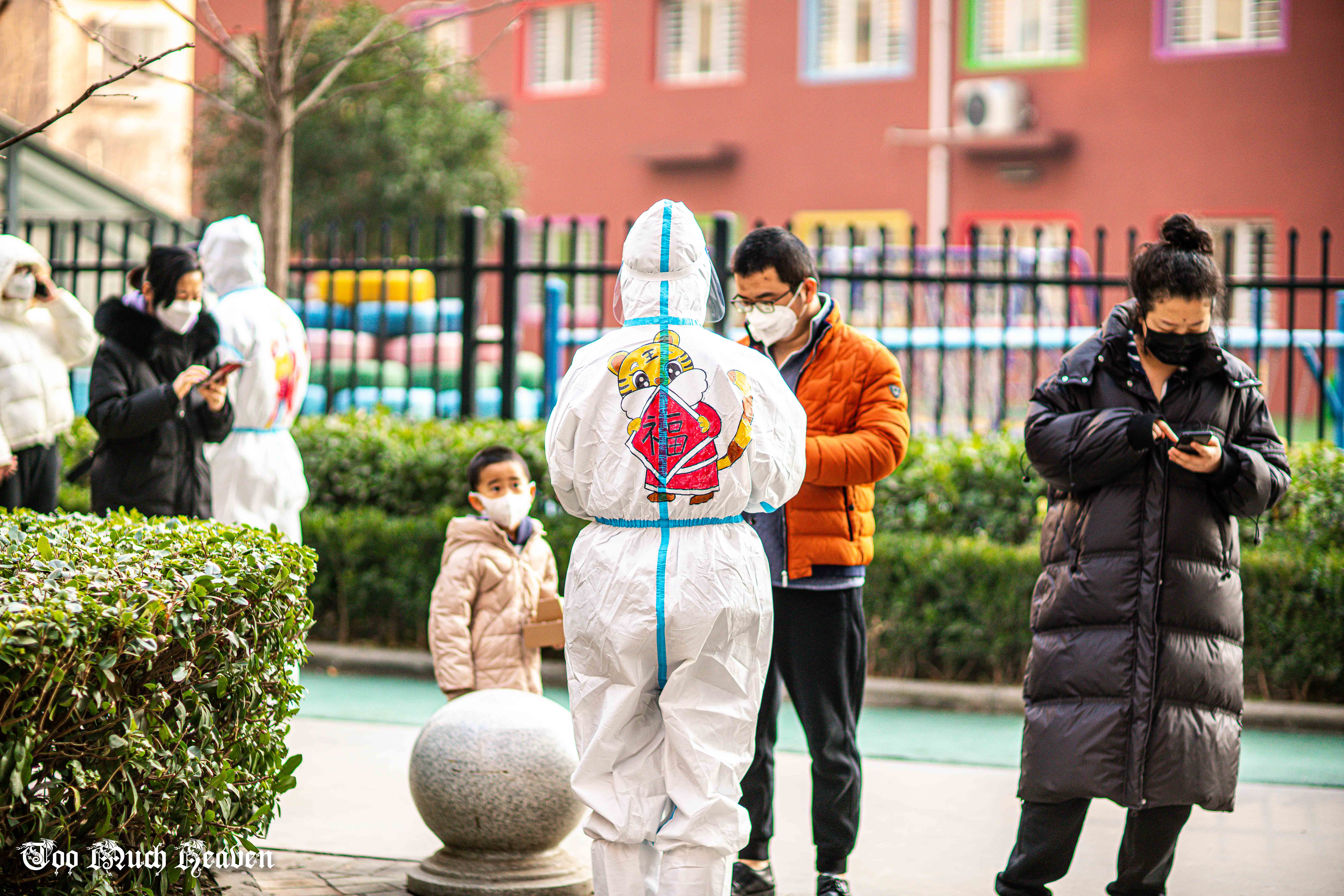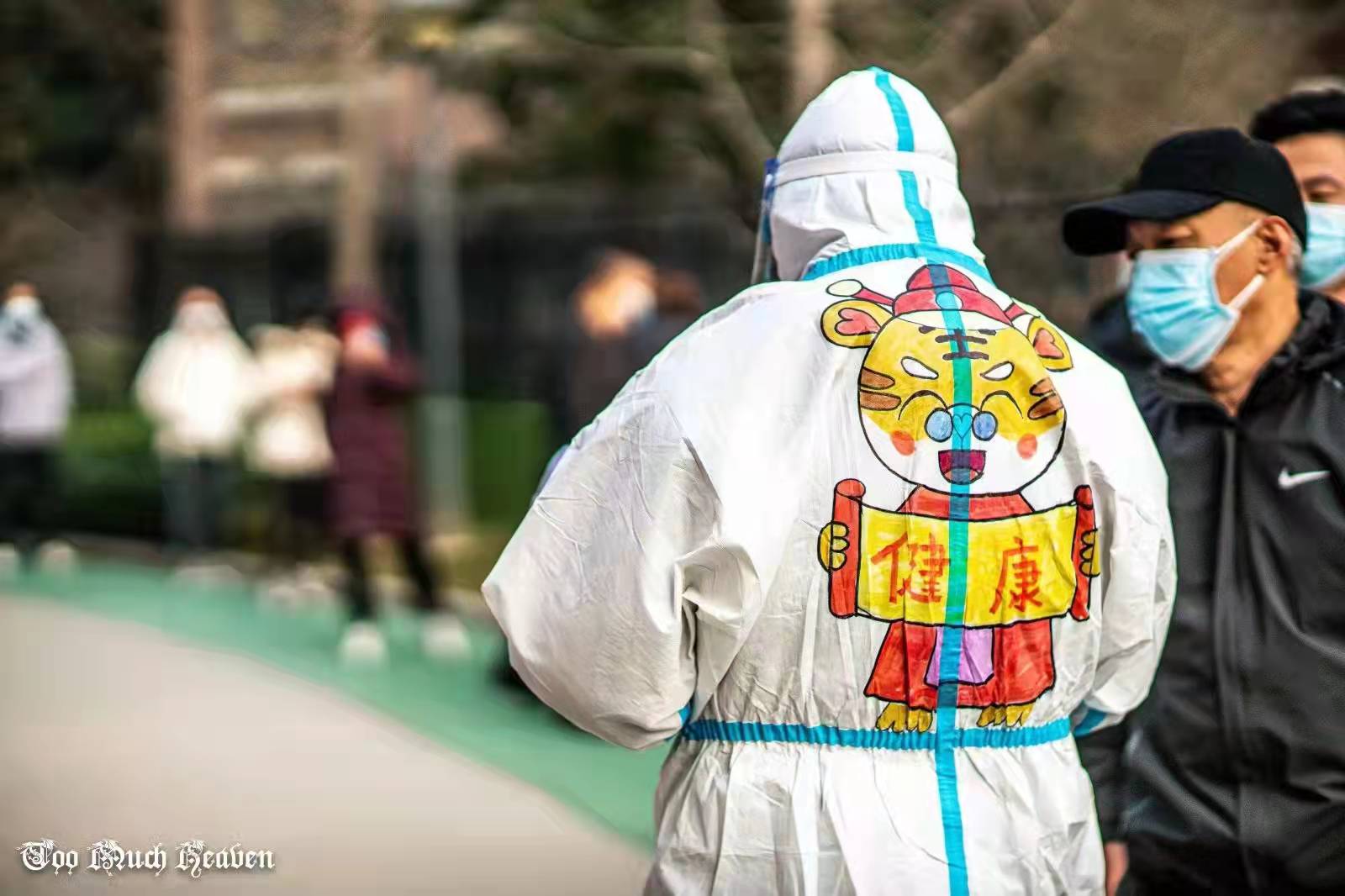這個(gè)小區(qū)有13位志愿者組成了“抗疫志愿者先鋒隊(duì)”,全程協(xié)助醫(yī)護(hù)人員做好核酸篩查工作。隊(duì)長(zhǎng)黨王杰每天要在防護(hù)服上為大家編號(hào)、寫(xiě)名字,以示區(qū)分。有一天,他寫(xiě)著寫(xiě)著突然來(lái)了主意,“在防護(hù)服上畫(huà)點(diǎn)不一樣的圖案行不行?疫情向好,新春臨近,來(lái)個(gè)虎年主題?”