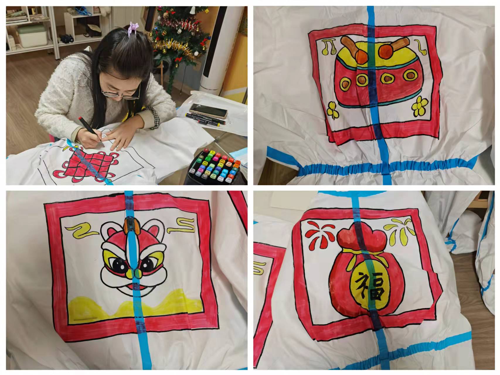 然而,令他們沒(méi)想到的是,“在防護(hù)服上作畫(huà),有點(diǎn)難。”吳捷介紹,防護(hù)服的表面材質(zhì)是皺的,需要一手鋪平、另一手用馬克筆畫(huà),“一幅畫(huà)畫(huà)下來(lái),需要一個(gè)多小時(shí)。”這樣,他們熬了一個(gè)通宵,才完成了13幅作品。