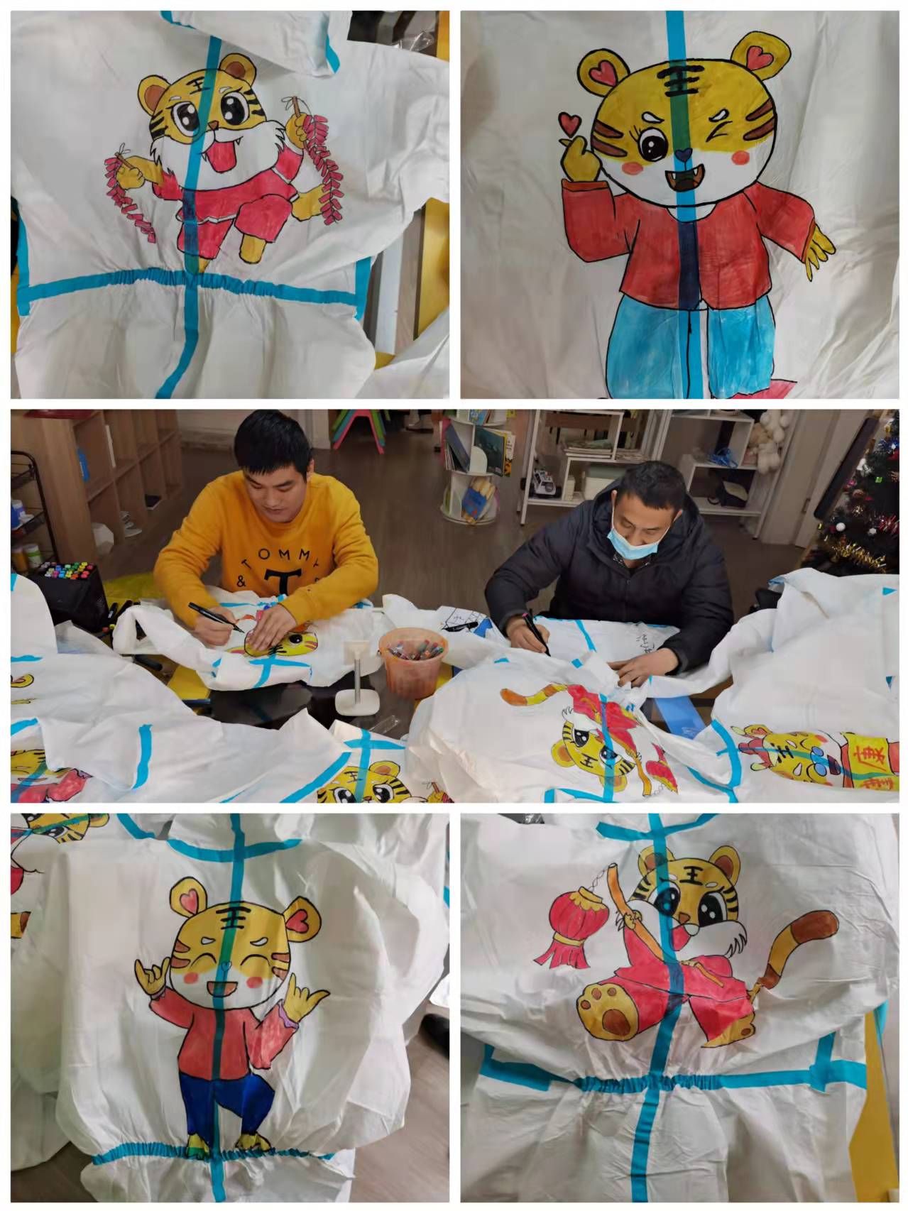 年輕人坐在一起“頭腦風(fēng)暴”,說(shuō)干就干,思考、設(shè)計(jì)出了虎年主題的防護(hù)服系列圖案。吳捷說(shuō):“這一系列作品,就是希望大家虎虎生威,遠(yuǎn)離病毒!”