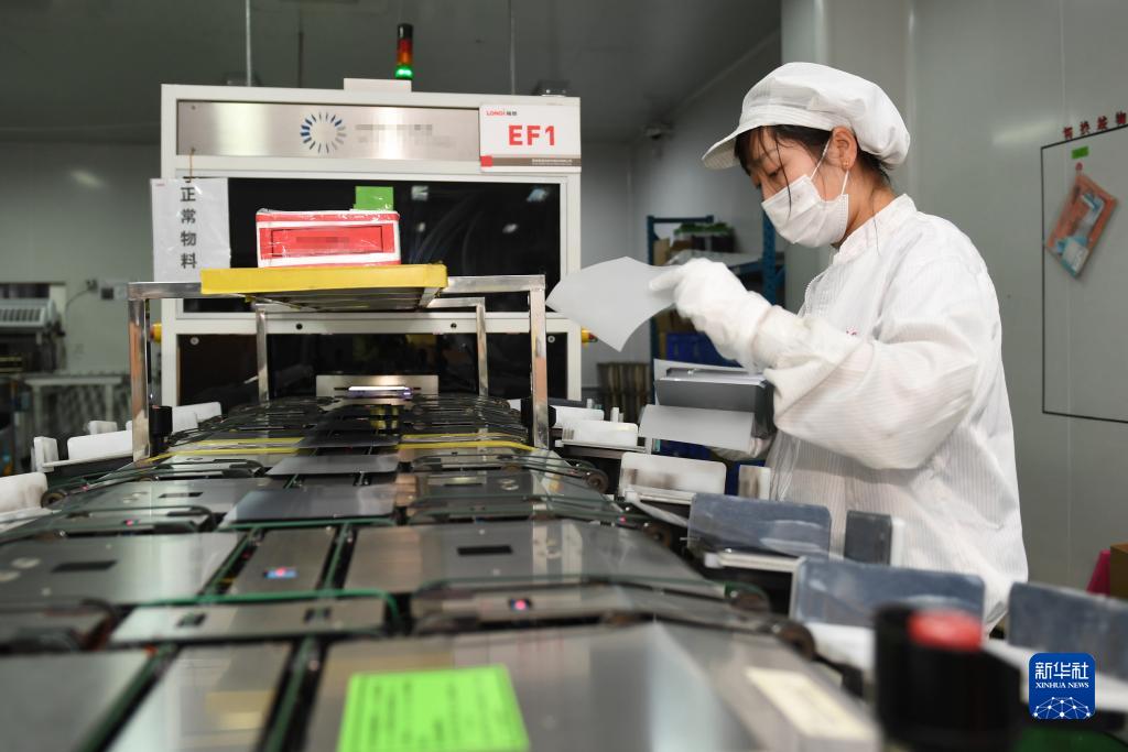 1月18日,在隆基綠能科技股份有限公司西安切片工廠,工人在進行檢測包裝作業(yè)。新華社記者 李一博 攝