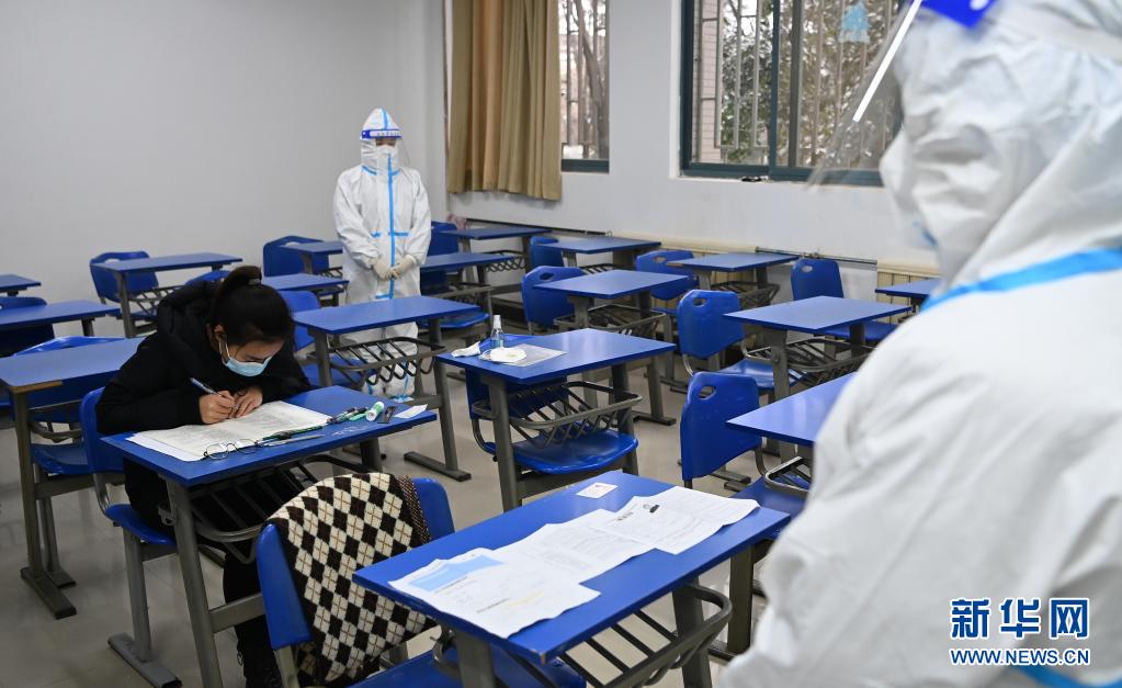在2022年全國(guó)碩士研究生招生考試西安外國(guó)語大學(xué)考點(diǎn)隔離考區(qū),監(jiān)考人員在單人隔離考場(chǎng)監(jiān)考??荚囍?,監(jiān)考人員全程著防護(hù)服工作,學(xué)生午休時(shí)不出考區(qū),學(xué)校為每名考生提供免費(fèi)午餐。各方全力以赴為考生“保駕護(hù)航”,確??荚図樌M(jìn)行。新華社記者 劉瀟 攝