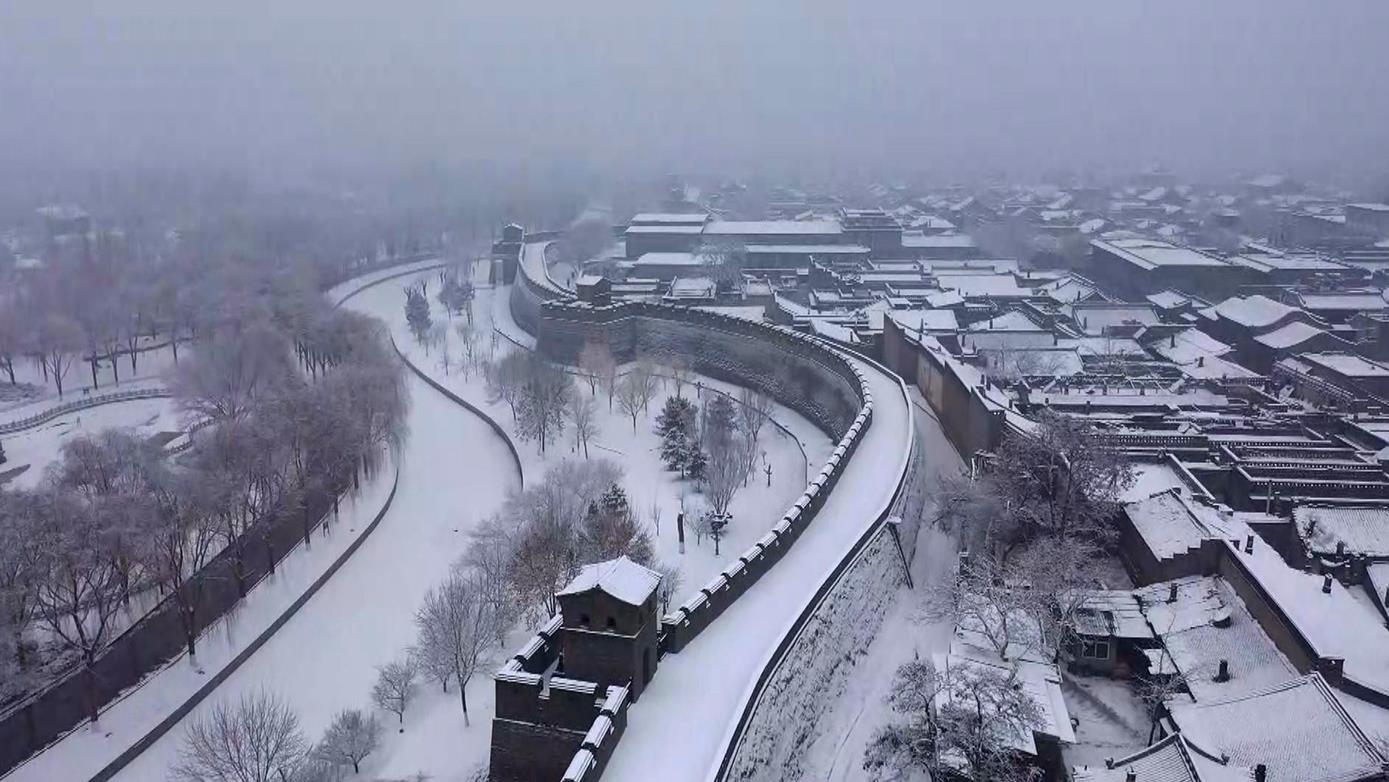 △2022年1月24日,平遙迎來降雪天氣,整個(gè)古城的輪廓被銀白筆墨勾勒出來。(總臺(tái)央視記者 范凱拍攝)