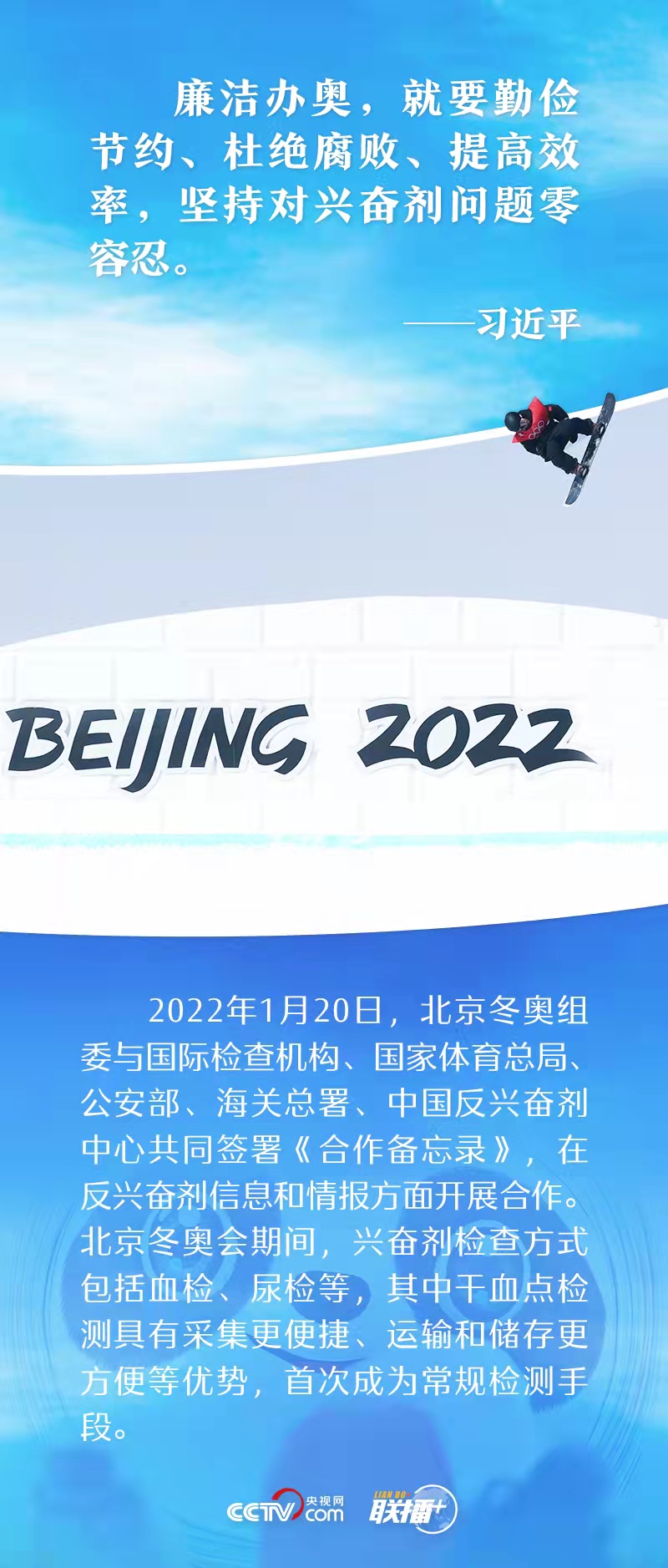 “能借不租,能租不買”極大地節(jié)省了物資采購成本;整合需求、減少流轉(zhuǎn)環(huán)節(jié),最大限度壓縮權(quán)力尋租空間,提高廉潔透明度;堅持對興奮劑問題零容忍......廉潔辦奧理念貫穿于北京冬奧會籌備、運行的各個方面。那么,這些具體措施都是如何落實的呢?央視網(wǎng)《聯(lián)播+》帶您一起了解。