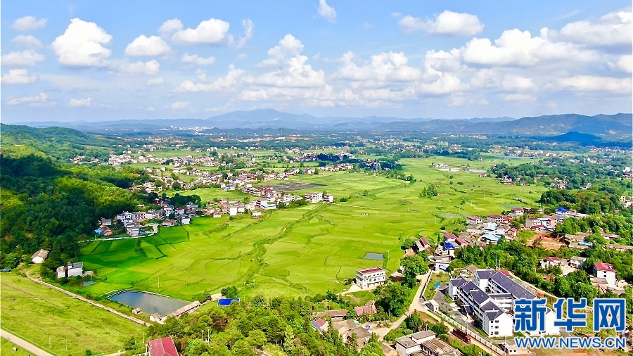 在江西省宜春市袁州區(qū)慈化鎮(zhèn)模山村,高標(biāo)準(zhǔn)農(nóng)田內(nèi)水網(wǎng)縱橫交錯,與村落、遠(yuǎn)山形成一幅美麗動人的鄉(xiāng)村畫卷。新華網(wǎng)發(fā) 劉卿 攝