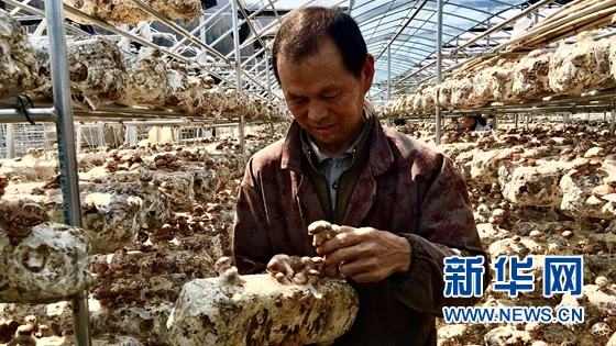 吉祥寺村村民余賢剛在采摘香菇。 新華網(wǎng)發(fā) 胡誠(chéng)攝