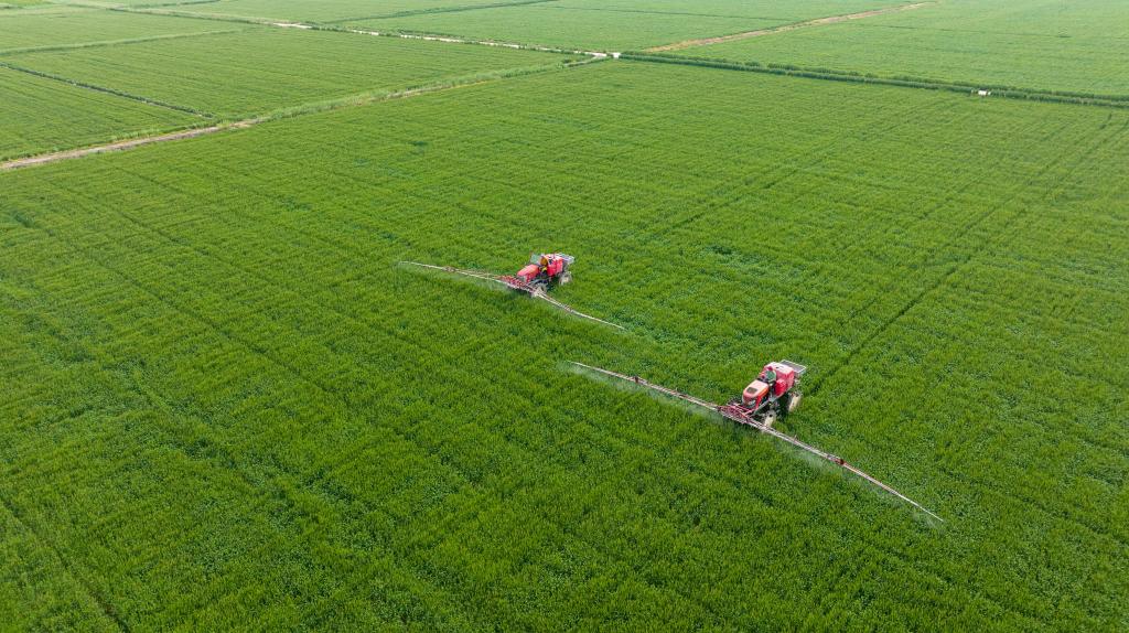 2022年4月20日,江蘇省海安市孫莊街道夏岔村一種植基地,村民駕駛植保機械在小麥田間作業(yè)(無人機照片)。新華社發(fā)(翟慧勇攝)