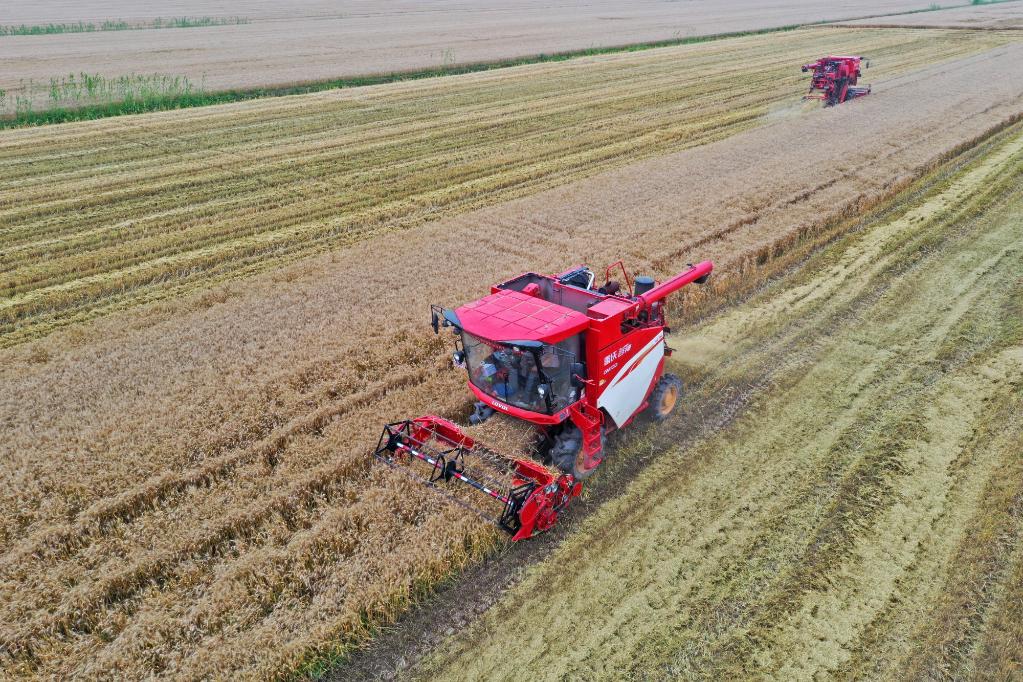位于安徽省宿松縣的華陽河農(nóng)場機(jī)收小麥現(xiàn)場。新華社發(fā) 李龍 攝