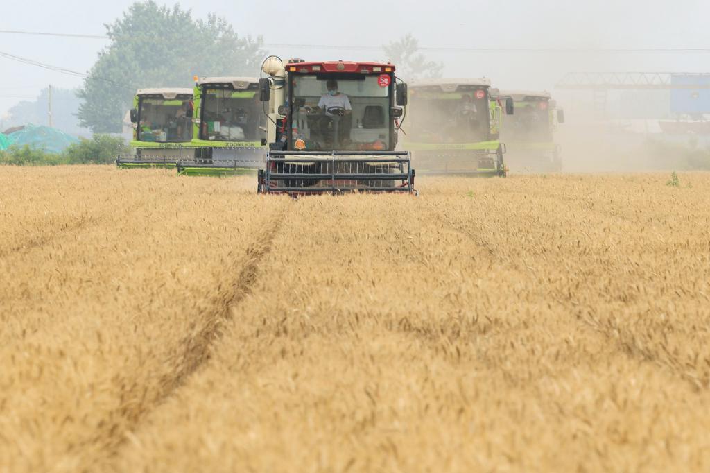 6月21日,河北省唐山市豐南區(qū)大新莊鎮(zhèn)大佟莊村,農(nóng)機手駕駛收割機搶收小麥。新華社發(fā)(李秀清攝)