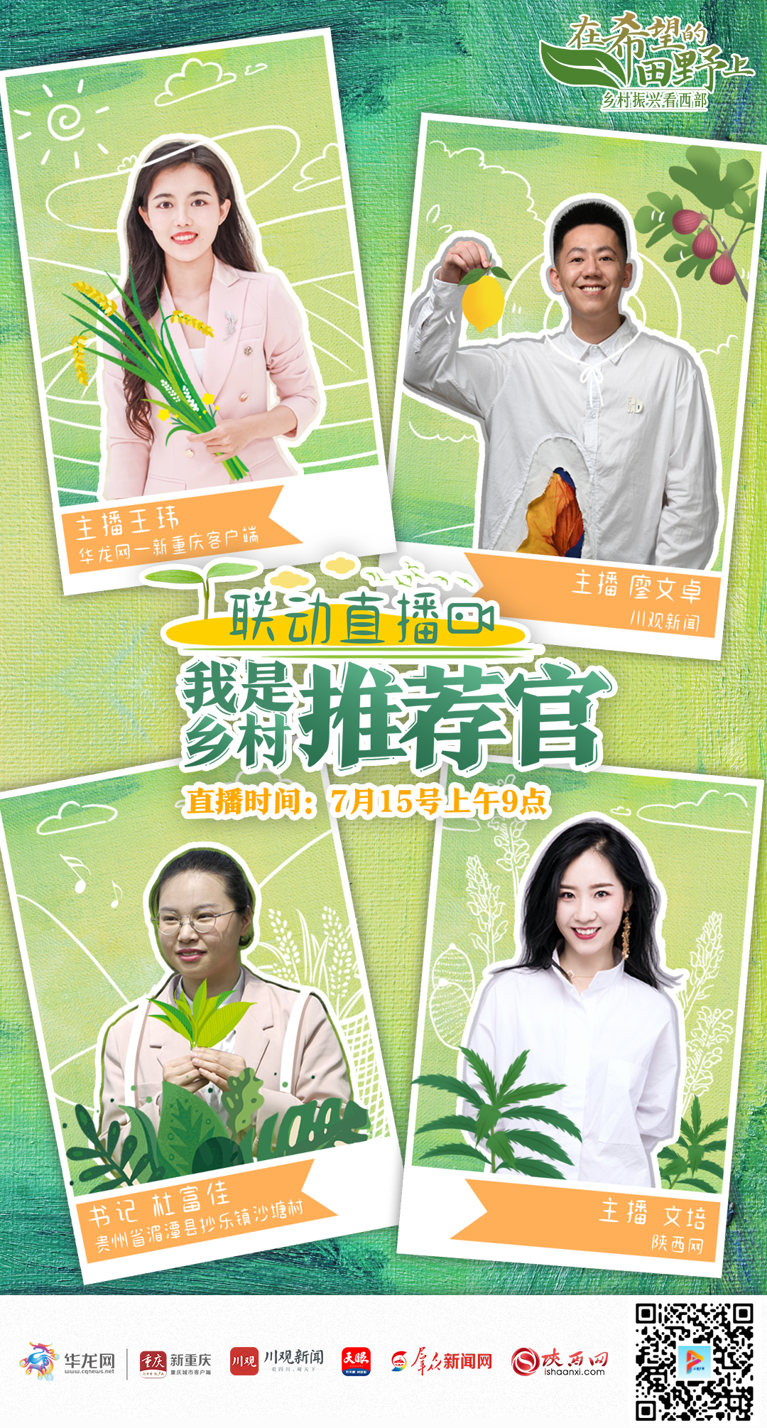 “鄉(xiāng)村推薦官”華龍網(wǎng)-新重慶客戶端主播王瑋、川觀新聞主播廖文卓、貴州省湄潭縣抄樂鎮(zhèn)沙塘村第一書記杜富佳、陜西網(wǎng)主播文培帶你走進(jìn)希望的田野,品美食、看美景、體驗(yàn)非遺特色,通過直播沉浸式打探各具特色的美麗鄉(xiāng)村,讓大家看到不一樣的西部!本次聯(lián)動(dòng)直播還特別設(shè)置了抽獎(jiǎng)環(huán)節(jié),15日上午9:00,敬請(qǐng)鎖定直播間!