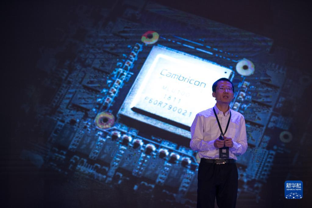 在上海國際會議中心舉行的發(fā)布會上,寒武紀(jì)科技公司首席執(zhí)行官陳天石介紹國內(nèi)首款云端人工智能芯片(2018年5月3日攝)。新華社記者 金立旺 攝