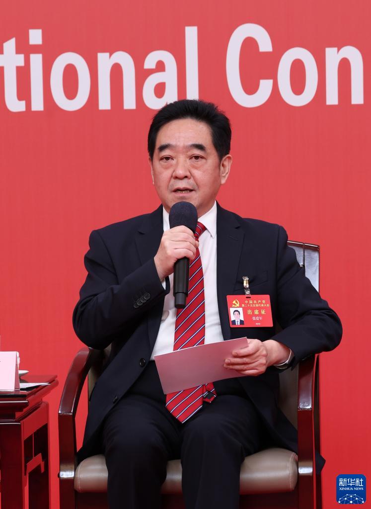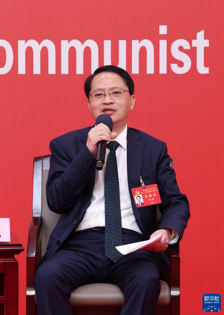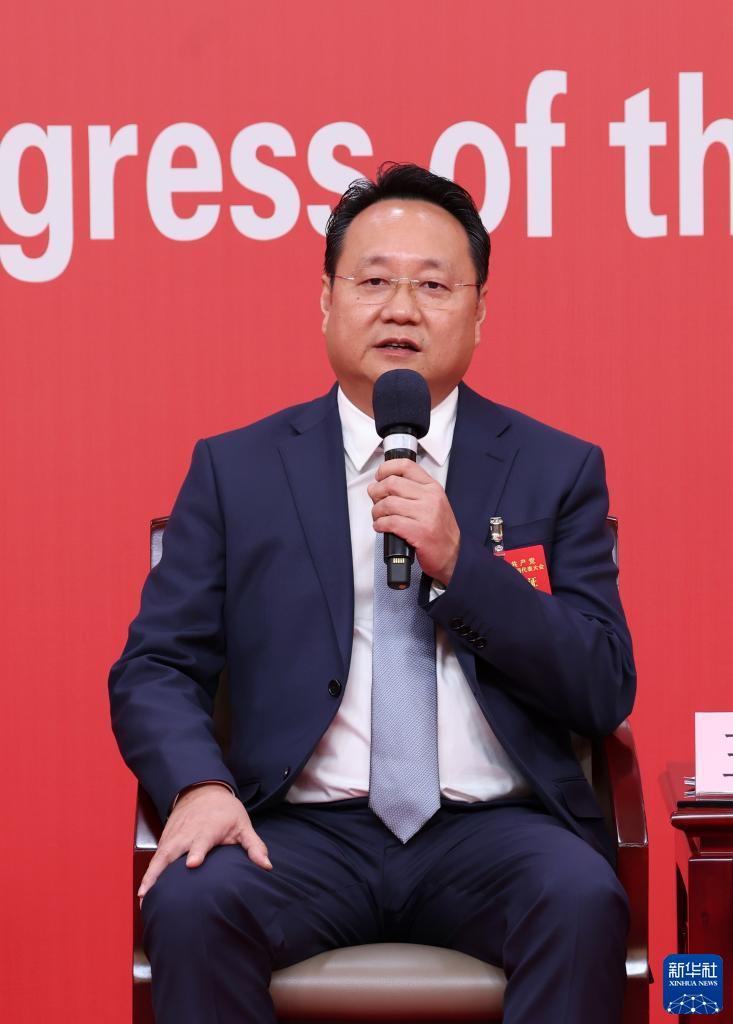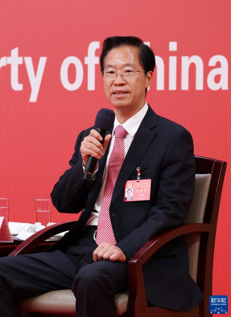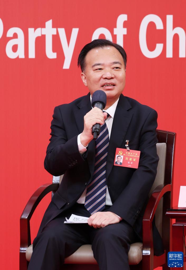 10月18日,中國共產(chǎn)黨第二十次全國代表大會新聞中心舉行集體采訪。黑龍江、上海、江蘇、浙江、安徽、福建、江西代表團(tuán)新聞發(fā)言人出席,介紹代表團(tuán)學(xué)習(xí)討論二十大報告情況,并回答記者提問。這是浙江省委常委、宣傳部部長王綱在回答記者提問。新華社記者 張玉薇 攝
