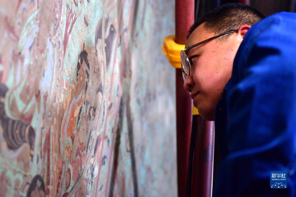 在莫高窟第231窟,敦煌研究院文物保護技術服務中心的壁畫修復工作者在修復出現(xiàn)病害的壁畫(2022年4月19日攝)。新華社記者 杜哲宇 攝