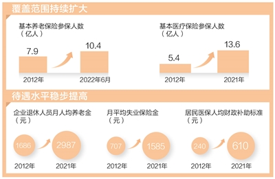 截至2022年6月,基本養(yǎng)老保險參保人數達到10.4億人;基本醫(yī)療保險參保人數2021年底已達13.6億人,覆蓋率穩(wěn)定在95%以上……更公平、更可靠、可持續(xù)的社會保障體系,托舉起人民群眾穩(wěn)穩(wěn)的幸福。