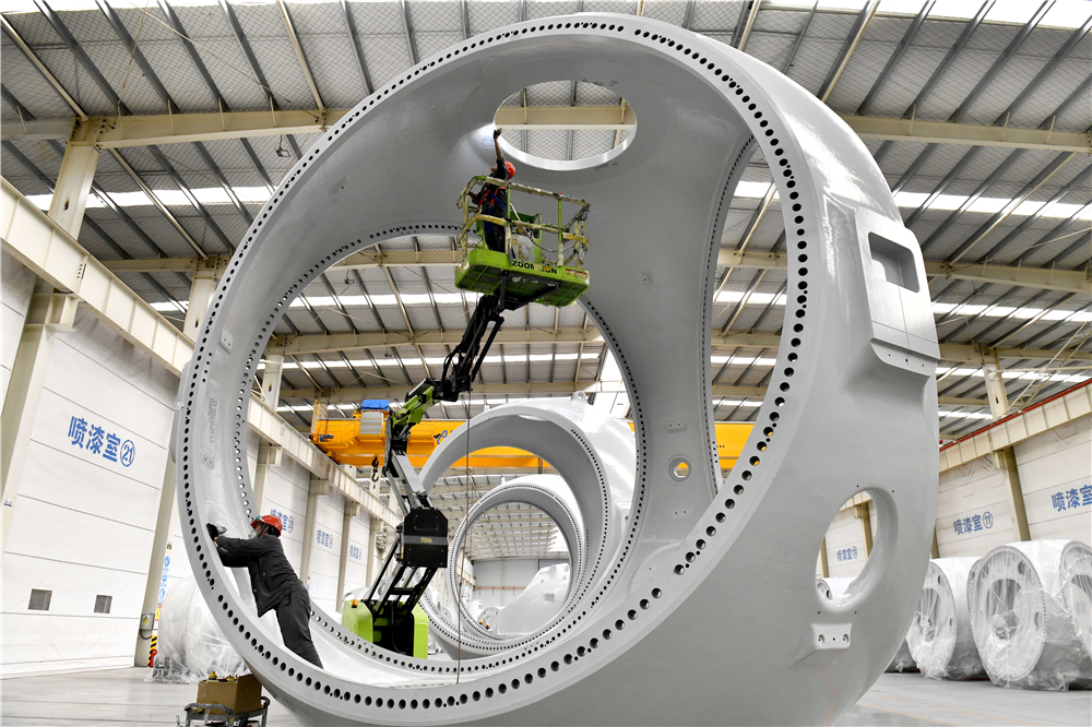在山東省惠民縣風(fēng)電裝備產(chǎn)業(yè)基地涂裝車間,工作人員對風(fēng)電輪轂進行涂裝(2022年6月7日攝)。新華社記者 郭緒雷 攝