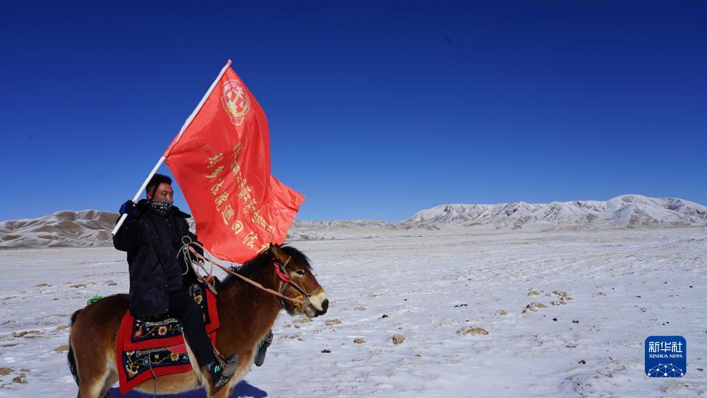 2021年12月20日,瑪多縣人民法院院長錢快乾騎著馬,擎著“瑪多法院巡回法庭”的旗子,下鄉(xiāng)進行普法宣傳。新華社發(fā)
