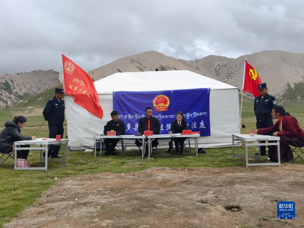 2022年7月12日,在瑪多縣冬格措納湖畔,當?shù)啬撩袢罕娫诼牞敹嗫h人民法院巡回法庭法律宣講。新華社發(fā)