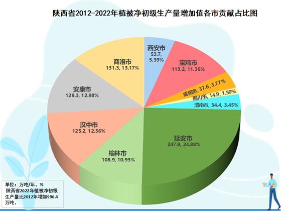 2012-2022年分市元生產(chǎn)量增長貢獻(xiàn)分析結(jié)果表明,各市對全省生態(tài)蛋糕增長均有所貢獻(xiàn),但各市的貢獻(xiàn)大小差異很大,在生態(tài)蛋糕中的地位也隨之有所變化。全國退耕還林策源地美稱的延安是全省生態(tài)蛋糕增量最大的市,10年增加247.9萬噸,為全省生態(tài)蛋糕增加量貢獻(xiàn)了24.9個百分點(diǎn)。商洛第二,10年增加131.3萬噸,為全省貢獻(xiàn)13.2個百分點(diǎn)。安康第三,10年增加129.3萬噸,為全省貢獻(xiàn)13.0個百分點(diǎn)。漢中第四,增加125.2萬噸,為全省貢獻(xiàn)12.6個百分點(diǎn)。其后,依次分別是寶雞增加113.2萬噸、為全省貢獻(xiàn)11.4%,榆林增加108.9萬噸、為全省貢獻(xiàn)10.9%,西安增加53.7萬噸、為全省貢獻(xiàn)5.4%,咸陽增加37.6萬噸、為全省貢獻(xiàn)3.8%,渭南增加34.4萬噸、為全省貢獻(xiàn)3.4%,銅川增加24.9萬噸、為全省貢獻(xiàn)1.5%。