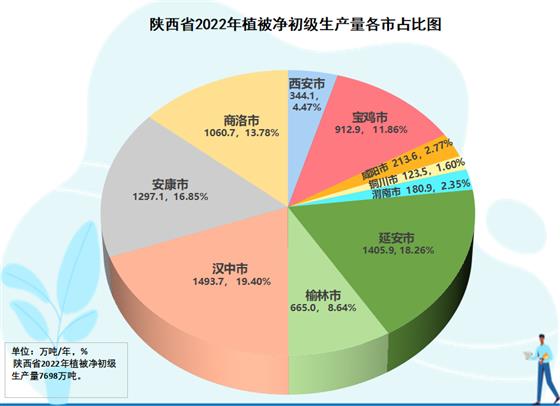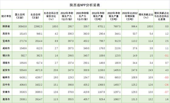 全省元生產(chǎn)力區(qū)域分析結(jié)果表明,在三大區(qū)域生態(tài)蛋糕越來越大的同時,生態(tài)蛋糕的空間布局上與結(jié)構(gòu)發(fā)生變化,呈現(xiàn)黃河流域綠色崛起大趨勢。陜北榆林、延安兩市,生態(tài)空間8971.6萬畝,占全省的39.6%;關(guān)中西安、寶雞、咸陽、渭南、銅川五市生態(tài)空間4554.5萬畝,占全省的29.2%;陜南漢中、安康、商洛三市生態(tài)空間9136.2萬畝,占全省的40.2%。2022年,陜北兩市提供了2070.9萬噸植被凈初級生產(chǎn)量,占全省的26.9%,比2012年的1714.1萬噸增加313.8萬噸,增長18.3%,在全省份額上升了1.3個百分點(diǎn);關(guān)中五市提供了1775.1萬噸的植被凈初級生產(chǎn)量,占全省的23.1%,比2012年的1524.3萬噸250.8萬噸,增長16.4%,在全省份額上升了0.3個百分點(diǎn);陜南三市提供了3851.5萬噸植被凈初級生產(chǎn)量,占全省的50.0%,比2012年的3462.7萬噸增加388.8萬噸,增長11.2%,在全省份額下降了1.6個百分點(diǎn)。2012-2022年全省新增生態(tài)蛋糕996.4萬噸,陜北兩市貢獻(xiàn)31.5%,關(guān)中五市貢獻(xiàn)29.5%,陜南三市貢獻(xiàn)39.0%。陜北、關(guān)中提供的生態(tài)蛋糕占全省的份額已由2012年的48.4%提高到2022年的50.0%。