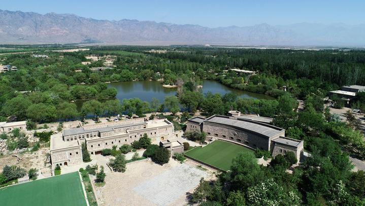 位于賀蘭山東麓的志輝源石酒莊(6月8日攝,無人機(jī)照片)。新華社記者 王鵬 攝